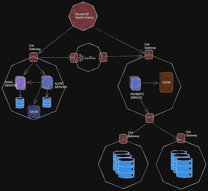 Inter-Cell Components: While cells are isolated components which can encompass multiple connected microservices, we need inter-cell components like Routers/Load Balancers/Message Bus to handle actions that span multiple cells.